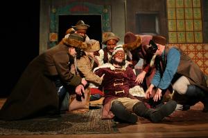 Le Revizor de Gogol, c’est l’histoire d’un énorme quiproquo : un inconnu débarque dans une petite ville de province en Russie où tout le monde le prend pour un "revizor", un haut fonctionnaire, chargé de contrôler l’usage que font les notables de la ville des biens et des fonds publics. Mais cette pièce est aussi une satire car, bien évidemment, les notables en question sont tous des profiteurs, qui abusent de leurs charges publiques à l’insu de la population ; le contrôle n’est donc pas sans les inquiéter. Voilà le canevas de l’intrigue, que conserve Emmanuel Ducasse, l’adaptateur de la pièce. Pour ce qui est du texte, il le réécrit entièrement, le modernise, y insère quelques piquantes références à notre actualité sociale et politique, mais en conserve toute la drôlerie.Sous sa plume, Le Revizor reste une satire, mais une satire légère, bouffonne. On trouve par conséquent tout à fait judicieuse l’idée de jouer cette histoire à la manière de la commedia dell’arte. Emmanuel Ducasse l’a imaginé, Alberto Nason, le metteur en scène et musicien italien, l’a fait. Sous sa direction, les comédiens ont admirablement travaillé leur jeu corporel et leurs voix, car qui dit commedia dit masques et c’est alors une forme de jeu bien spécifique ; n’ayant plus droit aux mimiques du visage, les acteurs doivent redoubler d’expressivité corporelle. Le résultat est excellent : on rit pendant tout le spectacle face à ces corps déchaînés et à leur pantomime caricaturale et grotesque. Allié à l’humour du texte, ce comique purement gestuel provoque dans la salle les éclats de rire immédiats qui caractérisent la farce. On passe ainsi un moment de franche gaîté, un moment théâtral extrêmement divertissant, ponctué de morceaux musicaux arrangés par Alberto Nason, qui est également présent sur scène. On n’a alors qu’une envie : reprendre en chur avec la troupe les chansonnettes au sujet du cochon braisé et d’autres sujets tous aussi intéressants et philosophiques !