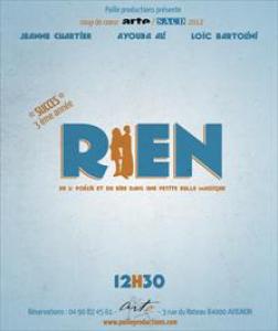 Rien, c'est un peu la pièce non identifiée du festival Off, car on ne sait pas vraiment à quoi s'attendre lorsqu'on s'y rend. Cette espèce de mystère autour de la pièce et de son nom renforce évidemment la curiosité du public, et certains ne pourront s'empêcher de venir la découvrir. Grâce à ce bouche à oreille, on se retrouve à notre tour plongés dans l'univers créé de toute pièce par Loic Bartolini et Jeanne Chartier, pour plus d'une heure de plaisir et d'émotion.Tom et Emma, les deux protagonistes de la pièce, forment un couple comme beaucoup d'autres : tout est beau au début, mais au fil du temps, les choses s'enveniment, jusqu'à parler d'un couple en crise. C'est alors qu'un troisième personnage fait son apparition, et les téléporte on ne sait trop comment dans un monde imaginaire, peuplé de personnages étranges, touchants, drôles et déjantés. Le but de ce voyage ? Les ramener sur le droit chemin, leur prouver qu'ils s'aiment encore... Cela aurait pu être une histoire d'amour classique, comme on en a déjà vu beaucoup d'autres. Mais au contraire, les auteurs ne sont pas tomber dans les travers de la comédie romantique, et ont pris le parti de nous compter cette histoire dans un genre fantastique. Chaque scène possède sa part de magie, de féerie et de poésie. C'est un plaisir, autant pour les yeux que pour les oreilles. Les deux comédiens principaux évoluent dans la peau de différents personnages remarquablement interprétés, si bien que parfois, le public rit, et parfois il est ému. On ne peut que saluer également l'intelligence de la mise en scène : peu de moyens matériaux, du mime et des jeux de lumière et de son suffisent à faire prendre vie à ce décor fantastique. Un moment unique qui au bout du compte ne peut laisser le public indifférent, quel que soit son âge !Finalement, on ne saurait définir véritablement ce qu'on y voit, tant chacun vit la représentation à sa manière. Le mieux est encore de la vivre...