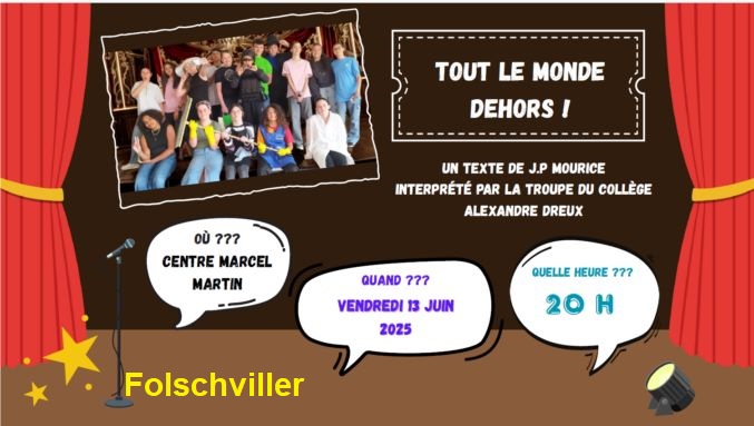 "Toutle monde dehors" sera joué le vendredi 13 juin 2025 àpar la troupe du collège Alexandre Dreux.