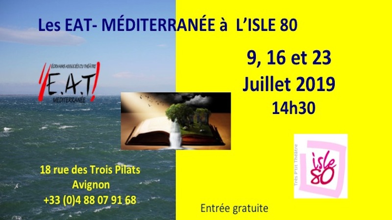 Durant Avignon Off 2019, tous les mardis de 14h30 à 16h40, lectures de textes en chantier d'auteurs de la délégation Méditerranée des Ecrivains Associés du théâtre, au théâtre l'Isle 80. Programme complet sur le site et le programme du Off et sur [site] Entrée gratuite dans la limite des places.