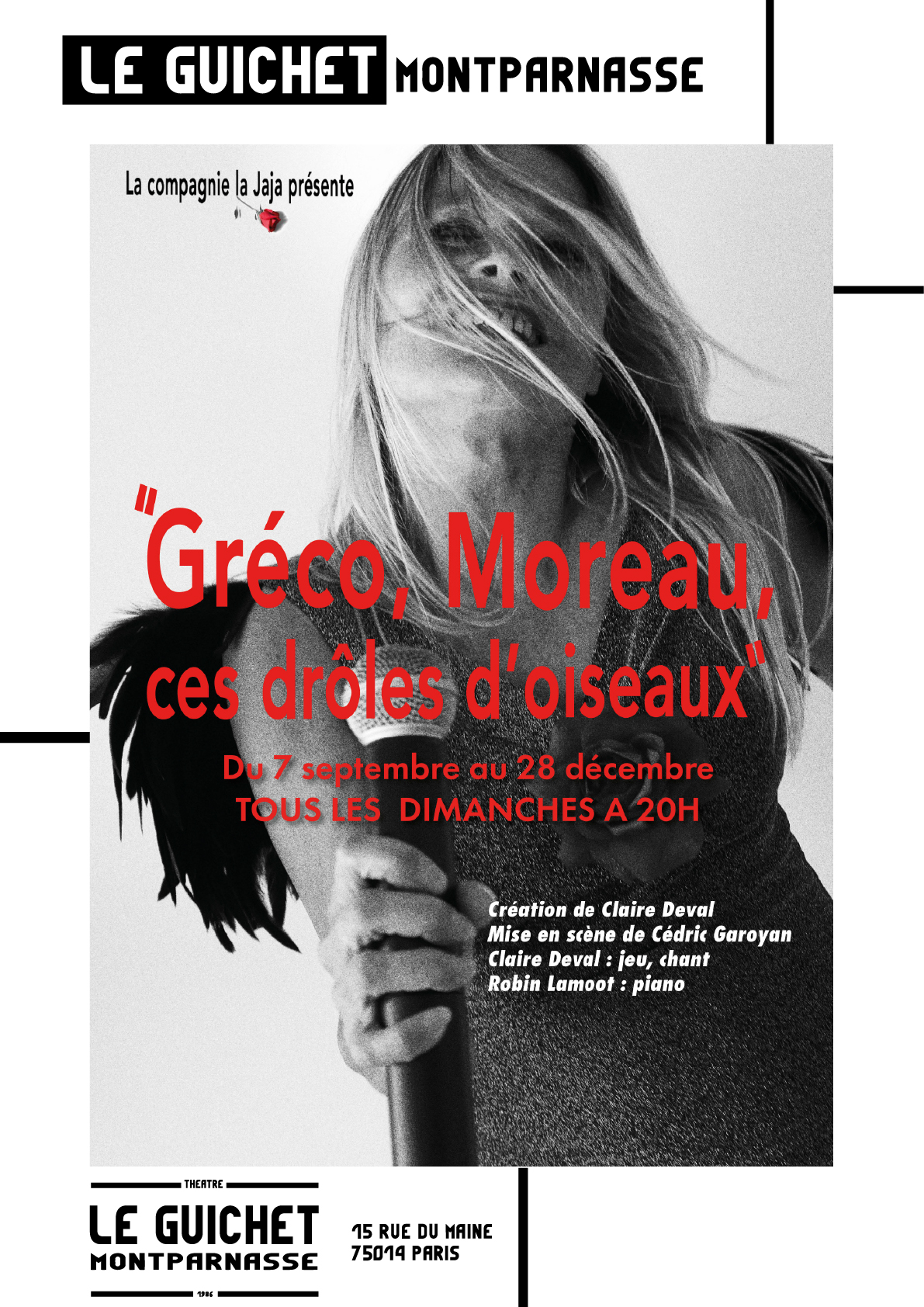 Je m'appelle Claire Deval. Je viens de Nice et suis directrice de la compagnie La Jaja. Depuis, dans le sud, je joue sur les planches, écrit (la jaja.com) et suis si heureuse de le faire. Ai écrit le spectacle " Gréco, Moreau, ces drôles d'oiseaux " qui se produit au Théâtre le Guichet Montparnasse du 7 septembre au 28 décembre. Paris, oui, Paris, là où tout commencé pour Juliette Gréco et Jeanne Moreau, il y a 70 ans. Deux femmes, au destin extraordinaire, libres comme le vent, qui ont marqué le vingtième siècle à tout jamais. Cette création est un voyage musical, narratif (s'inspirant parfois de l'imaginaire) et surtout, un hymne à la vie.
