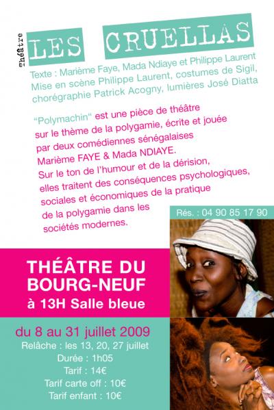 Par le parti pris du burlesque, Polymachin, écrit et joué par deux Sénégalaises, passe en revue le phénomène de la polygamie sur un ton tour à tour grave, affectueux, "historique" et comique. Un cur à prendre partagé entre deux, trois ou... quatre corps. Polymachin est un mélange d’expériences réelles autour d’une réalité qui dépasse souvent la fiction. C’est une création où le spectateur voyage et traverse le temps, comme un zapping, les images défilent et les situations rebondissent.Un spectacle qui traitre des conséquences psychologiques, sociales et économiques de la pratique de la polygamie dans les sociétés modernes, le tout sur le ton de l'humour et de la dérision.
