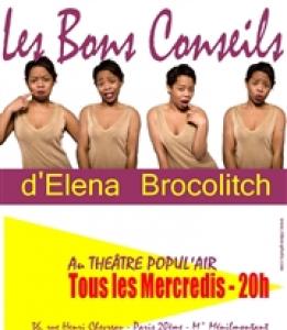 Dans ce one woman show à découvrir et faire partager, Elena Brocolitch fait preuve de beaucoup d’humour, de talent et de générosité. Avec encore plus d’énergie, elle revient des festivals d’Avignon et de Montpellier pour nous offrir ses facettes multicolores dans ce stand-up décapant. Pluriculturelle, d’origine afro-dionysienne, avec son écriture vive et intelligente, l’amie Elena nous propose ses conseils de femme, pas toujours recommandables.Nous revisitons les sujets qui touchent sans jamais rencontrer les stéréotypes habituels car sa grande force est l’originalité. Panel de femme enfant ou de vieille gourou invoquant les esprits, de la louve sexy à la célibataire en galère, la comédienne est mordante et drôle. Toutes ses trouvailles, son imagination et son inventivité lui promettent un bel avenir dans le café-théâtre.Depuis plus d’un an et demi, avec ce show, elle donne du plaisir à un public varié qu’elle fait participer et qui peut devenir acteur à son tour. L’interaction est différente à chaque représentation et la reine du stand-up sait créer une grande complicité avec les spectateurs grâce à son caractère attachant, émouvant et pétillant. Beaucoup d’authenticité et de sincérité jalonnent ces moments de partage et de vécu.