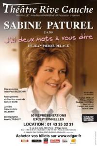 C'est sur la scène du Théâtre Rive Gauche que Sabine Paturel a choisi de revenir présenter son nouveau spectacle. Il faut dire que ses amoureux font légion et une vie ne serait pas suffisante pour satisfaire ce régiment d'inconditionnels de la fille aux cheveux bouclés qui se vantait de faire que des bêtises, des bêtises quand vous n'êtes pas là. Un coup d'il rapide dans les rangées de fauteuils, la tranche d'âge du public, la petite quarantaine grisonnante et quelques doyens, pas avares en pitreries, derrière leur masque de rides, une ode à la joie de vivre et à l'amusement.En tout cas, tout ce joli monde n'a d'yeux que pour elle. Ses années d'absence de la scène publique disparaissent d'un coup de baguette magique et voilà Sabine inchangée dans son jean lui a été changé depuis ! et ses bottillons de cowgirl.Le temps n'a pas eu de prise sur cette femme à la beauté simple et céleste et toujours aussi BAVARDE. Accompagnée par un trio de musiciens, trois chouettes gars qui la fréquentent depuis des lustres, elle n'arrête pas de jacter.En plus, elle est montée sur ressorts. Vas-y qu'elle se jette sur le petit canapé, la canopée à des souvenirs sommitaux d'un excès de vie rouillée qui la conduit à être abritée en unité psychiatrique. Psychédélique, elle l'est quand l'orage violemment gronde, ne voit-elle pas Dieu lui offrir une place à sa droite. Loin d'être envoûtée par l'esprit sain, Sabine se donne un peu de temps avant d'accepter les avances du Saint-Père.Son amie Martine ne cesse de la déranger au téléphone. Elle traverse un passage à vide, une crise de jalousie sur fond de névrose, la dépression la guette et déprime Sabine. Le vedettariat n'est pas l'apanage à qui le souhaite. Il se mérite, essaie de le faire comprendre Sabine à Martine. Ainsi va la vie.J'ai deux mots à vous dire s'associe à un monologue dont l'accent porte sur la fatigue intellectuelle engendrée par le succès d'une starlette de la chanson sur le déclin. Un conciliabule personnel qui passe en revue les heures de gloire, les amours échoués sur la grève en fond de scène, la médiatisation encrée à l'extrême, les amis, le fruit amer de la récolte d'une vendange primeur.Sabine Paturel, l'engouement renaissant sous son regard savoureux couleur pain d'épice, attrape le micro et chante quelques mélodies, un cru nouvelle génération qui s'écoute et s'apprécie sans modération. Son trio de musiciens n'a de cesse de la taquiner en reprenant les notes de la chanson qui lui ouvrit la voie des ondes radiophoniques et la fenêtre des chaines du petit écran, fin des années 80.Le public, amoureux de l'icône Sabine, attend ce moment depuis bien trop longtemps. Sabine, la véhémence dans l'ambiance du jour, chante enfin pour le plus grand plaisir de tout le monde "Je ne fais rien que des bêtises, des bêtises quand t'es pas là". La salle entonne timidement, puis avec frénésie le célèbre refrain. Merci Sabine. Merci les musiciens.J'ai deux mots à vous dire, une jolie mise en scène de Jean-Paul Bazziconi qui souligne avec pudeur le retour en grâce d'une star du music-hall, oubliée par tous ceux qui l'avaient porté au firmament de sa carrière sur les tréteaux de la gloire. Les tréteaux montés sur des sables mouvants ploient le charme rompu. Paillettes, strass, tapis rouge et cocktails mondains sont éphémères dans l'euphorie du moment. Les bulles de champagne non consommé s'évanouissent dans le néant.Une très belle interprétation de Sabine Paturel baignée entre nostalgie d'hier et l'envie de remonter à la surface aujourd'hui et demain. Un gage de retour pour toujours... Ses amoureux l'espèrent.Les musiciens, de joyeux drilles qui sèment la note et récoltent la graine du plaisir, le plaisir de les entendre jouer avec générosité les chansons reprises par Sabine.Si j'avais deux mots à vous dire, réservez vite vos places au théâtre Rive Gauche, 50 représentations exceptionnelles y sont programmées.