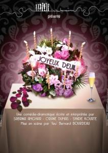 d’intrigue et de palpitation. L’attente se faisant, vous piétinez d’impatience sur le paillasson, vous devinez la pupille qui vous dévisage par l’illeton, vous entendez le "Voilà, voilà, j’arrive", faisant ressurgir soudain l’affolement, le doute et le manque de perspicacité de l’hôte qui vous convie. L’ouverture de la porte en ralenti ou en accéléré, tout se dit dans ce prélude à la soirée qui s’annonce. Les envies ne manquent pas à l’appel, l’envie du pipi de courtoisie, l’envie de jeter un il espiègle dans chaque pièce, l’envie d’être agréable, l’envie de s’assoir associé à l’envie de prendre un verre, l’envie de bavarder des p’tits riens qui font les grandes conversations, l’envie de ne pas aborder les choses qui fâchent, l’envie de ne plus avoir d’envie et l’envie de repartir. Invité et être invité, c’est un tourbillon de dépit et d’hypocrisie.La confrontation des ressemblances, Sabrina Amghar, l’auteure de la pièce, a su les éviter et pour ainsi dire n’y prête aucune allusion. Une plume alerte et agréable, des dialogues incisifs, l’emploi de mots justes et corrosifs composent Joyeux Deuil, une comédie écrite pour faire monter la moutarde aux yeux. Les dents grincent une heure durant et se desserrent dans des crises de larmes. N’ayez aucun doute, Joyeux Deuil est une Comédie avec un C majuscule comme comique. Une heure, c’est court et pourtant, Sabrina donne du fil à tordre à l’histoire des trois personnages de la pièce.Myriam s’apprête à fêter les 55 ans de sa mère. Un anniversaire digne de ce nom pour cette maman, actrice de renom. Zoé, la sur de Myriam, ne voit pas