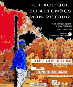 10h30, relâche les 11, 18, 25 juilletUne fois n’est pas coutume, commencer un article par la sortie du théâtre ! Je titube, j’en ai pris plein les tripes, j’ai mal et cela fait du bien. Larmes aux yeux… Et je ne suis pas le seul. L’émotion est contagieuse.