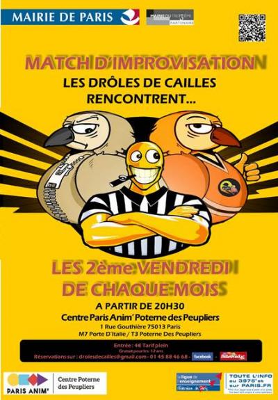 Chaque mois, les drôles de cailles invitent une nouvelle équipe pour un match d'impro déjanté, plein de rires, de surprises et d'émotion. A la fois théâtre et sport, le match d'improvisation est inspiré des matchs de hockey. Si vous avez envie de crier, hurler, huer, applaudir, pleurer et rire (voir pleurer de rire)... bref envie d’émotions fortes, alors c’est l’occasion ! Venez vous défouler avec nous, histoire de bien démarrer le week-end !
