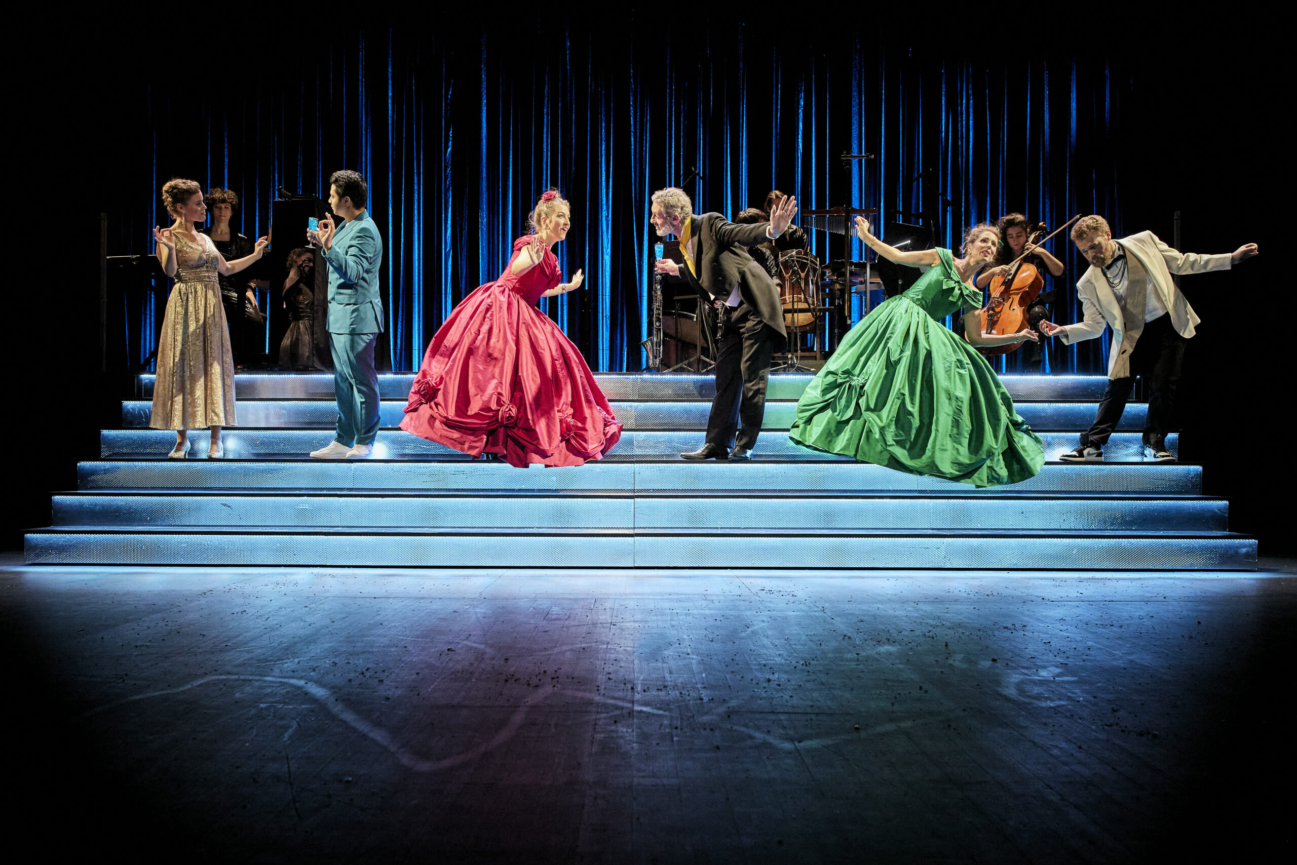 La version de Pauline Viardot possède, par ailleurs, l’avantage d’être courte, plus courte que celles de Rossini ou de Massenet. Cela permet à David Lescot de livrer un opéra d’un peu plus d’une heure, accessible aux enfants à partir de 7 ou 8 ans. L’histoire de la pauvre orpheline au service de ses demi-sœurs : sa sortie au bal, aidée par sa marraine la fée, la pantoufle de vair perdue en chemin, le mariage avec le prince charmant… Tout cela, n’importe quel enfant l’a vu chez Disney ou entendu lorsqu’on lui a lu les contes de Perrault ; le scénario n’est donc pas compliqué à comprendre, même lorsque le chant se fait lyrique et qu’il faut suivre le texte grâce aux surtitres. Les touches d’humour apportées par le personnage du père et du majordome du prince au passé frauduleux n’entravent en rien la limpidité du conte ; elles sont là pour faire sourire les plus grands, tandis que les petits s’émerveilleront plutôt de l’incroyable citrouille / carrosse électrique ou de l’apparition rocambolesque de la fée, tombée dans la cheminée. C’est grâce à ces trouvailles de mise en scène, grâce aux magnifiques costumes et aux décors inventifs que ce Cendrillon égale les grands opéras. On citera, pour exemple, les tableaux de maitre qui composent la toile de fond de la demeure de Cendrillon, représentant des musiciens fictifs mais dissimulant, avec des effets de transparence, les vrais musiciens. C’est lors de la scène du bal que l’on découvre enfin ces véritables instrumentistes, sur une estrade jusque-là cachée derrière le décor initial. C’est une belle réussite visuelle, qui est à découvrir de ses propres yeux, de même que les performances vocales des sept chanteurs sont à apprécier en live, de ses propres oreilles. Vous l’avez compris : nous vous recommandons ce Cendrillon version 2025 !