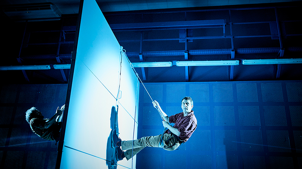 Le dispositif théâtral : un mur d’escalade, deux tapis roulants, une enceinte, quelques jeux de lumière et un peu de musique. Voilà de quoi symboliser les deux parcours des héros, qui vont marcher d’un même pas sur le tapis quand l’un va se préparer à jouer le rôle de l’autre, qui vont grimper chacun d’un côté du pan quand l’un va gravir l’Annapurna et l’autre rejouer la scène sur une montagne argentine pour les besoins du film. C’est astucieux. D’autant que le mur qui les sépare est blanc d’un côté, couvert de miroirs de l’autre : on peut y voir la neige et le reflet de la vie. Le théâtre exhibe ainsi les ficelles du cinéma, qui récrée la réalité, en la dramatisant au passage. Et le public peut suivre les comédiens dans deux univers qui s’opposent et dialoguent ensemble. Là encore la symbolique est forte, mais le plaisir visuel l’est plus encore.