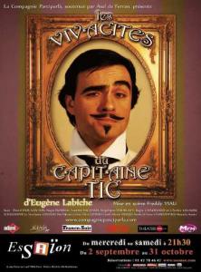 Une pièce inédite d’Eugène Labiche, créée et jouée en 1862, puis oubliée dans le fond d’un tiroir... C’est avec plaisir que l’on découvre ce texte malicieux imprégné du regard critique et amusé de Labiche sur la petite bourgeoisie de son époque.1861. Le sémillant Capitaine Horace Tic (David Dos Santos) revient de la guerre de Crimée et a démissionné de l’armée. Accompagné de Bernard, son ordonnance (Régis Romele), il est convié chez sa tante, Madame de Guy-Robert (Laëtitia Richard) qu’il n’a pas vue depuis dix ans. Il y retrouve sa cousine Lucile (Angélique Fridblatt), devenue une séduisante jeune femme, et en tombe amoureux. Mais Monsieur Desambois (Régis Chaussard), tuteur de la demoiselle, a promis sa main à Monsieur Magis (Charles Lelaure), scientifique reconnu mais austère et ennuyeux...Cette pièce dynamique fait la part belle à une mise en scène circulaire où le paravent central masque les entrées et sorties des personnages. Le décor astucieux offre des meubles et poufs d’époque, des rideaux dentelés d’où l’on peut voir une scène en arrière-plan. La mise en scène joue avec tous ses aspects tout en misant sur le dynamisme des personnages et des situations. On ne s’ennuie généralement pas avec les pièces de Labiche et c’est encore le cas ici ! Les acteurs s’amusent beaucoup et cela se voit ! David Dos Santos incarne l’explosif Capitaine Tic avec jubilation et les autres acteurs ne sont pas en reste, notamment avec le comique apporté par le fameux Monsieur Desambois (le très bon régis Chaussard !) qui provoque de nombreux remous... Par ailleurs, des chansons inspirées et de petites chorégraphies rajoutent une gaité supplémentaire. Un bon spectacle rondement mené, avec beaucoup d’humour et de rebondissements ! Un régal !