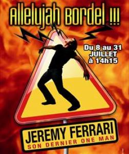 Comment parler d’un sujet aussi délicat que celui des religions, et tout cela avec humour, sans passer pour un véritable anti-religieux. Et bien Jeremy Ferrari, comédien et auteur de ce spectacle, l’a fait, et cela avec brio, dans son dernier one man show Allelujah bordel !!!. Partant de faits avérés, tirés du Coran, des Evangiles et de la Torah, il nous fait découvrir les non-dits de ces textes sacrés. Et ceci pour le plus grand bonheur des spectateurs.Grâce à sa plume aiguisée et à son incroyable énergie, il nous fait voyager à travers les époques bibliques en réinventant certains passages connus. Je fais référence notamment à la fameuse scène du paradis où Dieu nous explique que nous n’avons décidément et définitivement rien compris. "Ah, c’est humain !"Que ce soit l’ange Gabriel, Moïse ou encore le prophète Mohamed, toutes les personnalités de ces livres saints en prennent pour leur grade et c’est à mourir de rire.Allelujah bordel !!!, un one man show d’un talentueux jeune artiste multifacettes, ayant la capacité de passer de l’état d’humoriste à l’état de tragédien en quelques secondes. A aller découvrir ou redécouvrir absolument, au théâtre de l’Observance à Avignon.