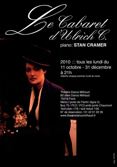 Tour à tour chanteur de charme et auteur sombre pour les interprètes féminines de son époque, ses chansons sont autant de bijoux qui vont comme un gant à Ulrich Corvisier et qui interpellent encore le public d’aujourd’hui.Ulrich Corvisier explore les tréfonds de l’âme humaine, sans nostalgie, dans le décor d’une Europe en ruine aux prémices de la seconde guerre mondiale, et ne revendique rien, sinon la volonté de donner à entendre son histoire à travers les textes et les mélodies de ses auteurs fétiches, et qui dévoile les secrets d’alcôve d’un homme moderne aux prises avec les tourments de sa jeunesse, tourments qui trouvent un écho tout particulier avec les chansons de l’entre-deux guerre.Energie du désespoir, insomnies, solitude, misère sociale côtoient dans ce cabaret la volonté de son interprète d’échapper à cette douleur par la poésie. La voix grave d’Ulrich Corvisier est littéralement emportée par son accompagnateur, le pianiste virtuose Stan Cramer, et tous deux redonneront vie à un monde de beauté peuplé de créatures perdues.