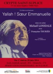 Françoise Thuriès incarne Sur Emmanuelle pour un mois chaque soir dans un lieu simple et sans prétention : une crypte, celle de l'église Saint-Sulpice à Paris. Le choix de ce lieu souterrain incongru et n'ayant rien d'un théâtre, correspond bien au caractère de celle qui toute sa vie, a su faire d'un rien, d'une peine ou d'une misère un torrent de joie. Partant du drame de la mort du père qui se noie devant sa famille à Ostende, Françoise Thuriès va nous faire traverser la vie passionnante de Sur Emmanuelle, de la période profane jusqu'à l'engagement religieux dans la communauté Notre-Dame de Sion au début de sa vie pour finir par l'ultime concrétisation d'une ONG baptisée Asmae.
