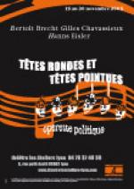 Têtes rondes et Têtes pointues n'est pas la pièce la plus connue de Bertold Brecht ; c'est pourtant l’une de ses meilleures. Cette "opérette politique" est une formidable satire, une pièce engagée et légère à la fois. Brecht dénonce le pouvoir de l'argent, la manipulation de la politique par les riches et la manipulation du peuple par la politique... avec humour ! La polémique se dit sur un ton amusant. Voilà comment lancer des pointes en arrondissant les angles! Et le message passe d'autant mieux.Mettez donc des têtes pointues d'un côté, des têtes rondes de l'autre. Ajoutez-y un dictateur, homme faussement providentiel, marionnette d'un vice-roi qui prépare son retour en force. Pourvoyez ce vice-roi d'une belle fortune. Séparez bien les pauvres des riches. Et vous obtenez une comédie satirique où racisme, égoïsme et intérêt sont pointés de la tête. La critique est universelle ; l'affrontement des têtes rondes et pointues, les Tchiches et les Tchouques, devient parabole : c'est notre misérable monde, empêtré dans ses conflits politiques et religieux, qui se retrouve sous nos yeux. La révolte de la "racaille" acquiert même une résonance particulière aujourd'hui. Les têtes pointues sont finalement têtes d’actu. Ah, ce Brecht, quel visionnaire ! Grâce à sa fameuse technique de la "distanciation", il nous pousse, nous autres spectateurs, à décrypter la parabole. Impossible de ne pas réfléchir face à ce spectacle pourtant d’une drôlerie à toute épreuve. Le burlesque des situations cache toujours une intention satirique ; rien n'est laissé au hasard.Et Gilles Chavassieux l'a très bien compris. Sa mise en scène, excellente, démultiplie les effets de distanciation. Adieu l'illusion théâtrale et place au recul critique. Le grand miroir au fond de la scène en est signe : le spectacle s'y projette comme un reflet de notre monde. Nous sommes fatalement invités à nous y mirer. Sylvain ne dira pas le contraire : nommé par son vrai prénom, le pianiste, Sylvain Freyermuth, accompagne allègrement l'action mais se fait surtout le témoin de cette parodie grinçante. Il est notre homologue sur scène. Car nous sommes mis à contribution nous aussi : le prologue nous est directement adressé avant que nous ne sombrions dans l'obscurité de la salle. Voilà la force de la mise en scène de Gilles Chavassieux. Les deux heures passent à vitesse grand V. De scènes parlées en morceaux d'opérette, les onze acteurs nous entraînent avec entrain dans le monde des Tchiches et des Tchouques. Allant et venant sur scène (avec quelques détours par la salle), ils entrent dans un ballet virevoltant. Réactions immédiates. Les rires fusent face à la naïveté et à l'entêtement du paysan Callas (Gilles Feuvrier), qui n'hésite pas à troquer sa prostituée de fille (Emmanuelle Fruchard) contre deux chevaux ! Les sourires apparaissent quand Mme Cornamontis l'entremetteuse (Eve Guerrier) pousse la chansonnette pour dénoncer la vénalité des femmes. Grâce à ces talentueux comédiens, "tchiches" de chanter et danser, nous passons un très bon moment de théâtre.