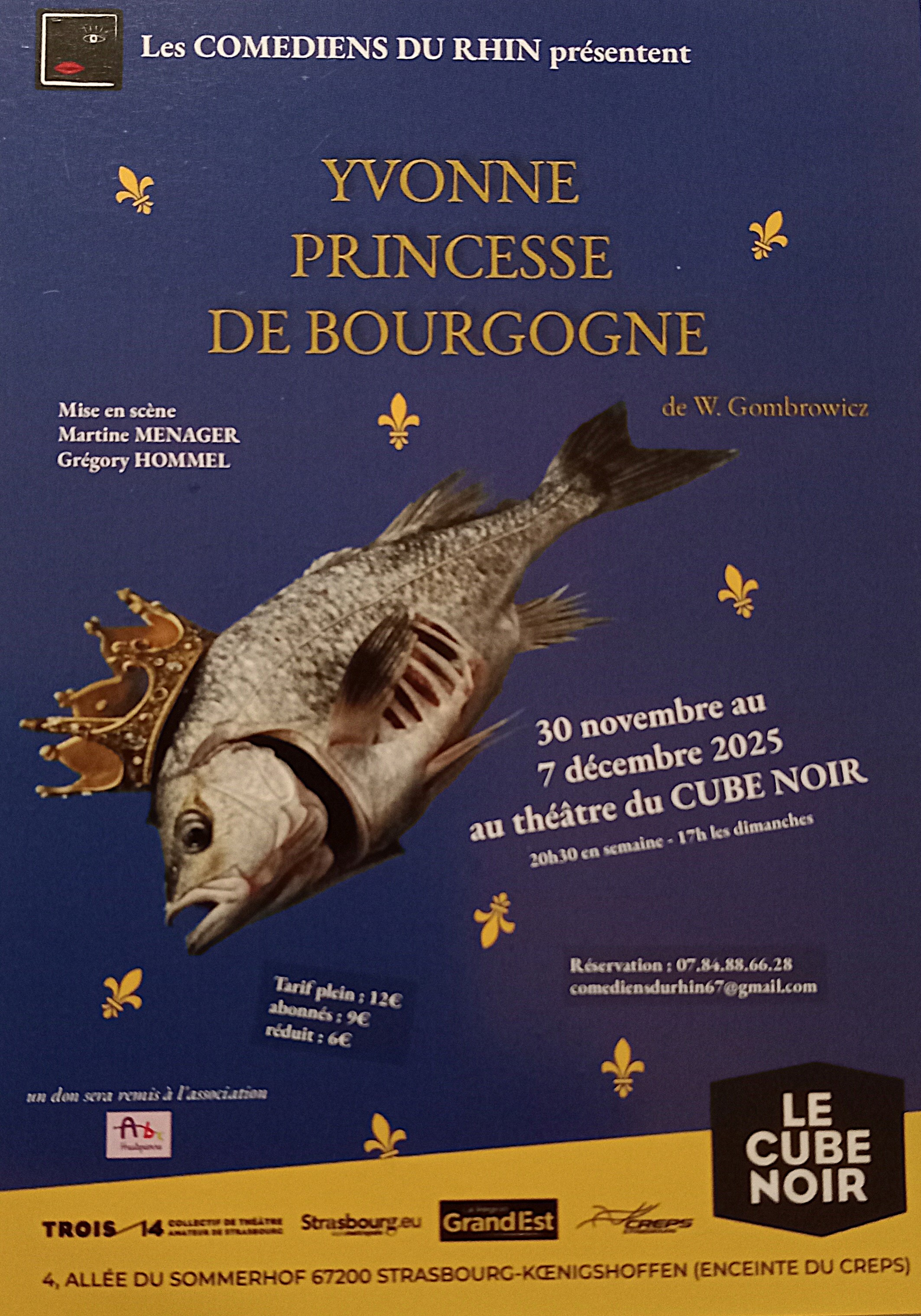 Bonjour, Je viens, à nouveau, vous informer du nouveau spectacle des Comédiens du Rhin, en espérant que vous pourrez le promouvoir. Il s'agit d'Yvonne princesse de Bourgogne que nous donnons, comme d'habitude, au théâtre du Cube Noir, 4, Allée du Sommerhof 67200 Strasbourg-Koenigshoffen. Du dimanche 30 novembre au.