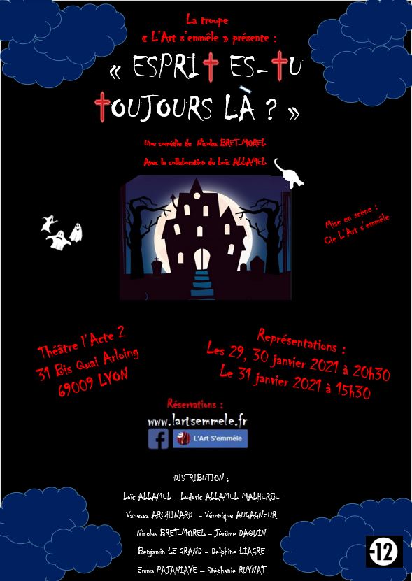 Cette pièce sera jouée sur Lyon les 29, 30 31 janvier 2021. Places disponibles via ce lien : [site] Un soir d’orages, Fred et Steph invitent leurs amis chez eux pour le lancement de leur site internet "adopte-un-esprit.com". Personne n’a jamais fait de spiritisme, sauf lui. Ils leur.