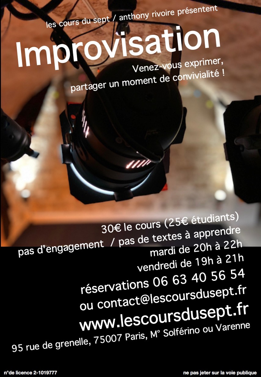 Cours d'improvisation mardi de 20h à 22h ou vendredi de 19h à 21h. Renseignements au 0663405654 ou contact@lescoursdusept.fr [site] 10 personnes max/cours. 95 rue de Grenelle 75007 Paris, M° Solférino (ligne 12), Varenne (ligne 13), Musée d’Orsay (RER C). Bus 63, 68, 69, 73, 83, 84, 87 & 93 - SPECTACLES