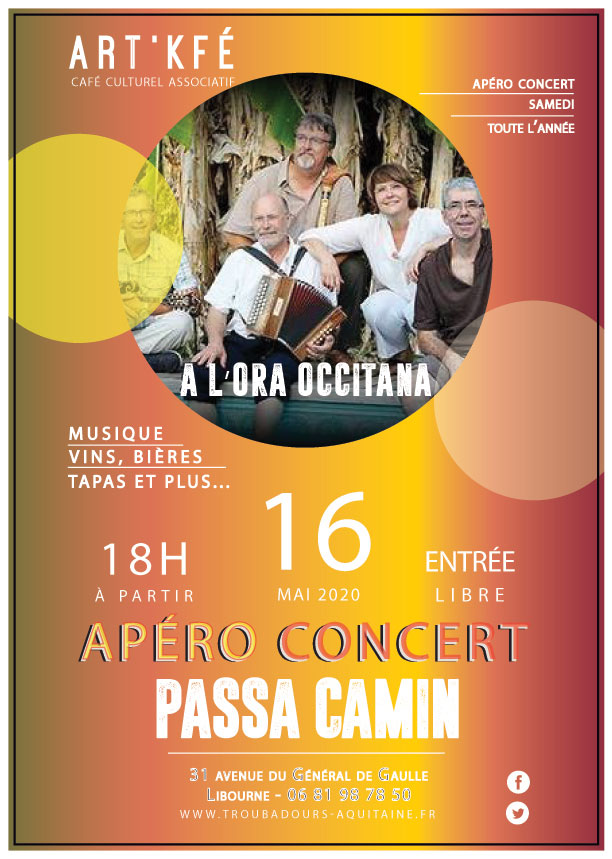 Samedi 16 mai 2020 Apéro concert Passa camin Danser et chanter et découvrir la culture occitane ! LIEN Facebook : [site] Entrée libre Restauration à partir de 18h Quelques exemples de notre carte : Assiette fromages ou charcuterie, brochettes de poulet au miel et au thym, terrine de légumes,.