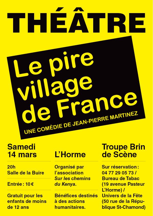 Le 14 Mars à 20h00 nous jouerons pour l'association "SUR LES CHEMINS DU KENYA" qui vient en aide aux enfants de ce pays. La pièce est de Jean-Pierre MARTINEZ, "Le Pire Village de France" comédie humoristique de 1 h 30. Ça se passera au Théâtre de la BUIRE à l'Horme. La bande annonce: [site]
