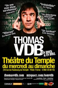 C’est sur un air de guitare que Thomas VDB entre en scène dans le Cabaret botanique du festival Mythos [site] mardi soir (1). Puis il nous fait entrer directement dans le vif du sujet : tout commence à l’adolescence quand il s’essaye à la musique "entre 15 et 16 ans". Il ne peut être musicien, que diable, il sera critique rock. Son spectacle s’articule autour de sa vie et de son expérience de journaliste, "vive les grass’ mat’", ses interviews de stars du rock venant en limousine ou bien... "du Limousin". Mais attention à ceux qui n’écoutent pas du rock, les amateurs de jazz notamment en prennent pour leur grade même s’il admet que "c’est pratique pour draguer les filles", il écorche également le hard metal, la techno, le dub ou encore la chanson rock. Ses anecdotes savoureuses sur Tommy Lee, la mort de Bon Scott (le chanteur d'AC/DC) dans son vomi ou encore la tragédie de Rick Allen, le batteur de Def Leppard, qui a perdu son bras dans un accident sont mises en scène avec énergie, alimentées par un vrai talent de comique.Son spectacle fait à la manière du stand up au fil de son bagou est comme un bon morceau de rock : des riffs puissants, des mots qui claquent comme une batterie et l’énergie d’une vraie bête de scène. Mais finalement, que ce soit au travers de ses articles, ses chroniques radio ou bien sous forme d’un spectacle comique, Thomas VDB transmet surtout sa passion pour la musique et rend un vibrant hommage au rock.