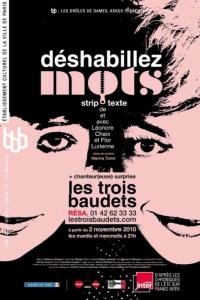 La matinale de France Inter, les samedis et les dimanches matin, réveille les auditeurs avec une chronique à vous apprendre le déculottage des mots de la langue française. C'est une nouvelle façon de découvrir le Petit Robert, fat et prétentieux, par les coulisses de la chose. Flor Lurienne et Léonore Chaix tiennent les auditeurs, attablés devant leur petit-déjeuner, le café fumant, en haleine. Le premier réflexe matin consiste à allumer le transistor sur la station "grandes ondes" car l'émission ne dure que trois minutes. C'est court et tellement bon de se laisser guider l'oreille à écouter ces deux animatrices expertes en l'art de dénuder le mot dans son intimité.Pudeur s'abstenir ! Cette fois, le duo de présentatrices radio se dévoile sur la scène des Trois Baudets. La soirée s'annonce haletante, le strip-show commence, les vestes volent, le public retient sa respiration. Jusqu'où iront-elles ? Même si Les Trois Baudets se situent au cur du boulevard de Clichy, entre peep-shows et cabarets coquins, ne vous attendez pas à un spectacle de nu intégral... Enfin, pas ici et pas dans le sens du mot que vous l'entendez.Le décor, une console de station radio équipée de deux micros HF, deux fauteuils rouges, la couleur du désir. En guise de jingle, Flor et Léonore présentent un chanteur qui va ouvrir la soirée, Tony Truant avec un T comme terrible. L'artiste dissimulé sous une épaisse tignasse s'accroche à sa guitare et chante quelques titres de son répertoire. D'une voix canaille et légère, les paroles s'envolent et se fondent dans le public. Les femmes apprécient surtout quand le ton glisse sous la ceinture.A la façon d'une interview radio, Flor et Léonore invitent les mots dans le studio. Ceux-ci s'installent confortablement, certains demandent même une coupe pour se sentir plus à leur aise.Les mots sont convoqués pour se livrer à un jeu de questions-réponses, une sorte de strip-tease dévoilant la dentelle brodée de leur intimité. C'est un chassé-croisé de mots qui viennent prendre place au micro. Flor et Léonore changent leur rôle en fonction des mots conviés ; l'interviewée devient animatrice et vice et versa. Il faut dire que selon les ébats soulevés, chacune ira en chair et en os répondre de façon alternative, courtoise, timide, révoltée ou taquine. Certains mots n'enlèveront pas le string par pudeur, des fois que des parties sensibles et généreuses attisent la frivolité féminine et la curiosité masculine.Branchez-vous bien sur fréquence Trois Baudets, ce soir de grands noms de la langue française viendront raconter leur karma. Ils débarqueront incognito et sans lunettes noires des pages du dictionnaire. Il faut bien avouer que ces mots sont tellement utilisés qu'ils sont rentrés dans les murs ; celles qui lèvent l'envie et d'autres qui... ça devient très intime et coquin.Léonore et Flor reçoivent La Légèreté, Le Mensonge, La Paresse, La Colère, La Pusillanimité, La Décision, L'Elégance, La Virilité et comment dire pour ne pas choquer, ni se laisser aller à des pulsions, L'Onanisme. Wouahou, ce petit dernier attire les foules jusque sur le parvis de Notre-Dame de Paris. C'est la première journée de l'onanisme organisée à Paris. Alors, forcément les adeptes affluent des quatre coins de la France et les doigts manifestent leur impatience d'aller en profondeur dans le mouvement.Tous ces mots se regardent l'oreille béante comme une galerie de portraits drôles et sensibles, virils et insouciants, timides et sauvages. Chacun d'entre eux masque une vérité dénudée de mensonge, un lapis-lazuli de bonheur sur le macadam obscur de notre rapport avec le langage.Les mots s'étalent sans état d'âme, se mettent à nu pour le plus grand plaisir du public qui jouit à chaque frasque.Léonore Chaix et Flor Lurienne lubrifient, avec la délicatesse et la voix qui les portent en exergue, nos cinq sens en éveil.Déshabillez Mots, une mise en scène de Marina Tomé des plus originales, sensuelles et savoureuses. Les Trois Baudets, une scène conviviale et tamisée pour accueillir ce spectacle... consonne, voyelle, consonne, voyelle, en chair et en os.