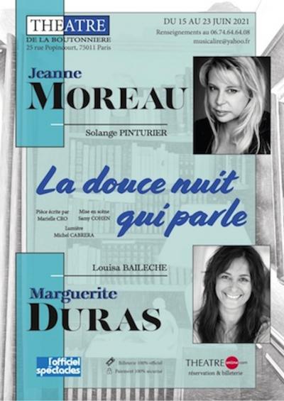 Marielle CRO l'auteur, de LA DOUCE NUIT QUI PARLE a imaginé une conversation entre Marguerite DURAS et Jeanne MOREAU, qui se retrouvent et s'expliquent sur ce long silence....