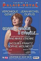 Il est souvent réjouissant de voir une vedette de la télévision sortir du petit écran. Ceux qui suivent les aventures de Véronique Genest seront ravis de la retrouver sans une foule de flics et de criminels autour d'elle. Les autres finiront par se demander ce qu'elle fait là, ou plutôt ce qu'elle voudrait faire là. Les acteurs célèbres ont le précieux privilège de pouvoir choisir leur texte, pourquoi n'en abusent-ils pas ? Attirer les autres rien que sur son nom est une vraie responsabilité, demandez à Philémon ;-)C'est l'histoire d'Anne (V. Genest) et Olivier (Jean-Michel Dupuis), celle de l'érosion de leur couple. Ils ont un enfant, ils sont mariés depuis 17 ans, ils s'ennuient tranquillement. Ah, l'amour fou, tout ça, être amoureux, c'était si bien, comment faire ? Tiens, voilà justement que ce matin, Olivier est tombé par hasard sur une ex qu'il avait beaucoup aimée. Aïe. Et que justement cet après-midi, Anne est appelée par un ex qui l'avait beaucoup aimée. Ouille.Des hasards comme ça, au début de la pièce, d'accord. Pourvu que la suite nous emporte. Ah, l'amour fou, la pulsion, la passion, le rythme... Car les deux ex, à nouveau libres et en chasse, devraient être tentants et menaçants. C'était du moins l'intention de l'auteur, Anne-Marie Etienne. Pourquoi le metteur en scène (la même) ne l'a-t-elle pas respectée ?Malgré tout le talent de Sophie Mounicot et de Jacques Frantz, il nous est impossible de croire qu'Anne et Olivier puissent courir le moindre danger. Inverser la distribution eût été bien plus piquant. Mais deux vedettes auraient-elles accepter de relever le défi et de jouer les seconds rôles ? Oui ? Alors, il n'est pas trop tard :-) Non ? Alors, il est trop tard. C'est aussi simple que cela. Trop tard déjà pour que cette pièce, où la nostalgie recherchée tourne à la mollesse et la mélancolie distillée à l'atone, connaisse un franc succès. De grands noms ne suffisent plus pour faire de grands publics. Cela restera gentillet, et c'est :-(Car les acteurs semblent piaffer d'impatience et de ressources inexploitées par la mise en scène. Ils voudraient s'éclater, se lâcher, rire, hurler, pleurer, manipuler, tirer les ficelles... jouer "à l'italienne", la comédie (du désir) et les grandes scènes (de ménage). De-ci de-là, c'est d'ailleurs leurs pointes de délire qui nous font le plus rire. Moments trop brefs, trop contenus par un texte trop sage et très laborieux.Le thème est vieux comme les couples, pourquoi pas ? Il sera encore traité dix mille fois. Mais alors, que l'on nous y prenne et nous y emmêle. Pour de bon et pour de rire. L'auteur doit être un dynamiteur, dit Ionesco. Et le théâtre, rebelle et insaisissable, rendre les cerveaux disponibles... à plus d'intelligence et d'humanité. Sinon, autant faire plan-plan devant télé pan-pan pub. Docilement.
