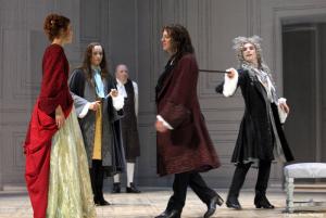On dit souvent des textes de Molière qu’ils trouvent une étonnante résonance à notre époque encore et ce, sans doute, parce qu’ils semblent tenir un propos toujours d’actualité. En effet, si la société a changé, si les fausses prudes et beaux esprits ne sont plus tout à fait des types d’aujourd’hui, les personnages de Molière restent des hommes aux caractères et aux vices universaux. Dans Le Misanthrope plus particulièrement, le dramaturge tend à ses contemporains un miroir dans lequel il nous semble nous apercevoir également. Certes, nous ne tenons plus salon, nous ne vivons pas à la Cour, mais ne sommes-nous pas toujours enfermés dans des rôles que nous jouons en société ? Certains d’entre nous ne rêvent-ils pas d’un exil loin des convenances et des conventions sociales ? (Il n’est qu’à voir le beau film de Sean Penn, Into the Wild, pour comprendre que c’est une interrogation d’actualité.) Et, de surcroît, les relations amoureuses ne sont-elles pas toujours aussi compliquées ? Les tensions existant entre Alceste et Célimène sont, en effet, caractéristiques des incompréhensions qui naissent entre les hommes et les femmes, ou plutôt entre deux types de personnalités différents : lui, rêvant d’un exil à deux, loin du monde, afin de jouir pleinement de son amour fusionnel ; elle, coquette et mondaine, préférant entretenir plusieurs relations, amicales ou autres, n’accorder son amour qu’avec parcimonie et ne pas s’enfermer dans le couple, cercle trop étroit pour ses aspirations de femme à la mode.Tout cela, et le texte et les problématiques humaines, est restitué à merveille par la troupe de la Comédie Française et la mise en scène de Lukas Hemleb. Décors extrêmement sobres et glacials : de hauts pans de murs blancs, transparents, sur lesquels sont peints d’imaginaires panneaux de bois, à la mode du temps de Molière. Costumes d’époque. Jeux de lumière qui font varier les atmosphères, nous faisant passer de la chaleur et de l’intimité des tête-à-tête à l’ambiance froide des rencontres mondaines. Effets de transparence, qui nous laissent deviner les silhouettes derrière les murs. La symbolique est intéressante : dans une telle société, pas d’intimité ; tout se voit, tout se sait ; personne ne peut vraiment se cacher et, surtout, cacher sa vie, ses affaires à autrui. D’où l’absence d’autres éléments de décor qui viendraient permettre aux protagonistes de s’isoler. Dans cette promiscuité, le jeu des comédiens se fait subtil et serré, au sens physique du terme : ils jouent les uns avec les autres, les uns contre les autres. Tous leurs gestes sont millimétrés, à l’instar du combat à l’épée de Clitandre et Acaste, les deux marquis. On ne peut que constater la maîtrise de la mise en scène. Le Misanthrope retrouve ainsi toute sa verve et tout son piquant, près de quatre siècles après sa création.
