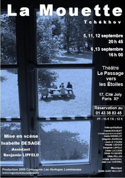 L'action se situe dans la propriété de campagne d'une actrice célèbre sur une période de deux ans. Les spectateurs assistent à l'incommunicabilité qui règne entre les protagonistes aux prises avec des questionnements relatifs à la création artistique, littéraire et théâtrale. L'amour et le désir de reconnaissance sont source de multiples enjeux et sentiments antinomiques omniprésents tout au long de la pièce. Les préoccupations des personnages de Tchékhov font écho à celles des spectateurs et des créateurs d'aujourd'hui, le plus souvent de façon spéculaire. A cet égard, nous pouvons constater l'effet produit par la scène de "théâtre dans le théâtre" de l'acte I. Ainsi et jusqu'au dénouement, le public est spectateur d'une tragédie évoquant non pas des héros mythologiques ou des personnages illustres mais des gens ordinaires.Si, d'après Antoine Vitez, cette pièce offre aux metteurs en scène et aux acteurs une large ouverture interprétative, il m'a semblé important de proposer une mise en scène à caractère intemporel tout en mettant l'accent sur la trame émotive qui provoque la parole et enfin le "dire" des mots de l'auteur. A cet égard, j'ai également cherché à peindre non "la chose mais l'effet qu'elle produit" grâce au rythme du texte, aux silences mais aussi aux regards.En choisissant de ne pas restreindre les propos de cette pièce à une époque donnée, j'espère confronter activement le public à ce spectacle tout en faisant appel à son imaginaire. Aucune réponse n'est donnée mais de cette « friction » devrait naître une réflexion commune autour de l'art contemporain et du rôle de l'artiste, de la critique ou encore de la reconnaissance.Cette pièce est interprétée par des comédiens amateurs et des comédiens professionnels ; elle est la première création de la compagnie née dans le but de donner vie à ce spectacle. Les grands textes comprenant une distribution importante sont de plus en plus difficiles à mettre en scène, faute de financements suffisants pour des petites ou moyennes compagnies sans subventions. Ainsi, de part l'engagement et la générosité de ce groupe de comédiens et grâce à ceux qui nous ont aidé, La Mouette a pu voir le jour. 30/08/2009