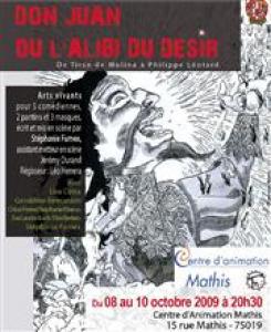 Arts vivants pour quatre comédiennes, deux pantins et trois masques, au service d'un Don Juan féminin, libre ou prisonnière de son plaisir où la comédienne, artiste plasticienne et mime, Stéphanie Fumex mélange les Dom Juan littéraires de Zurilla à Léotard en passant par Tirso de Molina, Molière, Brecht, Pouchkine, Lorenzo Da Ponte et Kundera. Entre héritage et rupture, Dom Juan ou l'Alibi du désir réanime le théâtre antique par les arts contemporains : la vidéo, la peinture vivante, le chur sonore, dans une proposition esthétique contemporaine et plurielle où les rideaux se tirent et se ferment pour brouiller les pistes de l'identité de chacun. Au XXIe siècle, Dom Juan est une femme. Libre ou prisonnière de son désir, elle se moque, séduit, se cache, déchire, grandit, foudroie et dérange. Ses mains n'épousent qu'un vaste chantier vide et dévastateur. Dévorons ce mythe poussiéreux pour faire éclater l'âme qui l'obsède.