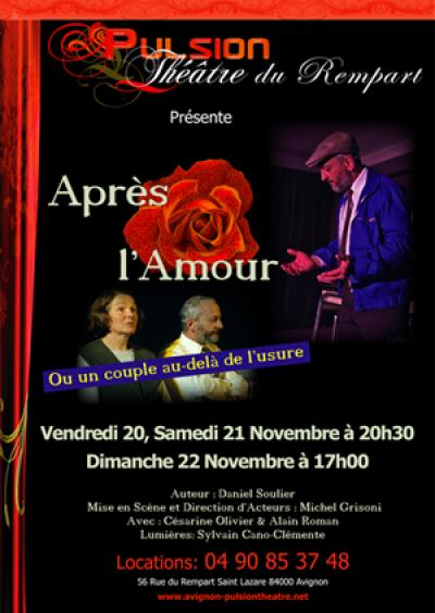 Après l'amour, pièce écrite par Daniel Soulier et mise en scène par Michel Grisori, nous montre un vieux couple, Jeanne et Henry, interprétés respectivement par Césarine Olivier et Alain Roman, qui vit, ou plutôt survit. Elle râle, de tout, tout le temps; lui se réfugie dans son vieil ami le communisme en qui il croit depuis toujours et qui reste, à l'heure de la retraite, sa seule passion. Ils luttent contre la mort, la leur et celle des autres, contre la modernité (achat d'un téléphone qui finira le fil coupé, pour éviter qu'il ne sonne encore et annonce de mauvaises nouvelles) mais aussi contre leur quotidien qu'ils ne veulent pas fleurir par avarice.Le théâtre est intimiste, le décor aussi : la scène est une salle à manger pauvre, peu garnie; ils sont là, se parlent, se disputent. Lui parle communisme, camaraderie, elle fait le ménage vigoureusement, ponctuant la plupart de ses phrases par un "c'est du propre ! Le jeu des acteurs est vrai, on finit même par s'attacher à cette vieille râleuse qui n'aime ni la pluie ni le soleil et qui pense que la vallée se referme. Des acteurs simples, qui se parlent comme ils auraient pu se parler dans la vie, sans chichi mais avec honnêteté, et puis tant pis si ça fait mal.Elle, avec son visage de petite fille malgré ses rides, qui esquisse parfois de petits sourires derrière ses grosses lunettes, sincère, mal-aimable mais amoureuse tout de même. Mais qui n'en n'oublie pas moins de faire les comptes, le ménage et de surveiller son fumeur de mari. Lui, badin, la casquette vissée au sommet de la tête, qui pense encore qu'il peut faire ce qu'il veut alors qu'il est surveillé par sa femme, qui le maternera jusqu'à la mort ! Mais il est bien content de rentrer avec son Huma' sous le bras. Enfin, quand sa Jeanne lui donne assez d'argent pour se l'offrir. On y croit à ces personnages, on y croit parce que ça leur colle à la peau et qu'on entre tout de suite dans l'histoire. D'ailleurs si on n'avait pas été au théâtre, on aurait pu croire qu'on regardait par le trou de la serrure... Un spectacle à la fois drôle, touchant, simple, poétique. On en ressort le sourire aux lèvres. Mais quelques questions sur notre façon de vivre rôdent quand même... par exemple, qu'est-ce que le bonheur ? Pourquoi ne pas prendre le temps d'apprécier une baguette chaude qui craque sous la dent, plaisir simple mais si important ? Ça ne changera pas nos habitudes de vie, ça ne nous bouleverse pas, mais ça fait du bien quand même...