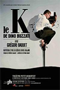 Les contes de Dino Buzzati, auteur de l’uvre majeure Le Désert des tartares, sont tout à la fois des instants de vie allégoriques autant que des démonstrations de philosophie. A la fois titre d’une nouvelle et du recueil emblématique portant le nom de K, cette uvre qu’on peut qualifier de sociologique met en exergue les particularismes de chacun des personnages qui la composent dans une mise en scène de Xavier Jaillard aussi sélective que fidèle à la pensée de Buzzati.Dans cet état de fait, partant d’un travail scénique sobre, en adéquation avec le contenu, il fallait un décor dépouillé : un K en bois, seul matériel et le talent de conteur aux visages multiples, celui d’un jeune comédien : Grégori Baquet.Incarnant là un personnage fantastique, il passe d’un rôle à l’autre dans le choix et la chronologie voulue par le metteur en scène pour que les spectateurs soient témoins des reliefs essentiels : incarnation de nos sensibilités exacerbées, de nos vies conjuguées, de nos drames, de nos félicités. Dans une remarquable scénographie où le "K" objet du décor et prédicat de l’uvre siège au centre, Grégori Baquet qui nous a habitué plus à la petite lucarne qu’au rideau de velours rouge, nous invite au voyage seul en scène, psychopompe d’un imaginaire incongru, jouant de simplicité et d’un art dramatique bien maitrisé, dans un espace temps à la faveur d’une précision horlogère puisque quinze nouvelles suffisent à condenser la mythologie de Buzzati en thèmes aussi monumentaux que la solitude, la mort ou la fatalité.