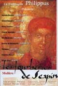 Il y a le Molière des grandes comédies qui voulait peindre son temps (Le Misanthrope, Don Juan…) et il y a le Molière des farces qui voulait faire du théâtre à l’état pur, sans se soucier de psychologie ou d’étude de mœurs mais en se concentrant sur le mécanisme de cette bombe atomique qu’est la farce. Dans les Fourberies, ce mécanisme est réglé à la perfection. En effet, pas une seconde de répit dans cette pièce grâce à Scapin, véritable manipulateur de génie. Le schéma narratif récurent dans les œuvres du maître (un barbon avare s’oppose au mariage d’amour de jeunes amants au profit d’un mariage par intérêt) est ici traité avec une légèreté et une virtuosité dans le dialogue qui fait de cette pièce un ballet endiablé multipliant les scènes d’anthologie.Le spectacle présenté au Guichet Montparnasse exploite à merveille les ressorts comiques de la pièce. Il y a tout d’abord la performance d’Olivier Zaro (Scapin) que son jeu riche, inventif et empreint d’un cabotinage viscéral rend irrésistible. Visage rieur, sourire diabolique et assurance à toute épreuve font de ce Scapin un démon qui manipule son monde avec une délectation sans pareil. Qu’il s’amuse à composer un marchand de tapis gouailleur ou un mafieux prétentieux, tout le monde y passe ; que ce soit les jeunes amants (il malmène physiquement Octave (Rémy Jaladieu), fils soumis, en prétendant lui apprendre à affronter son père) ou le vieil avare Géronte qui se fait embobiner, dépouiller et battre. A côté de Scapin qui fait sensation, certains petits rôles tirent leur épingle du jeu. On citera Gérard Desestre qui seconde bien Scapin dans la fourberie, notamment dans une scène de pure délire où déguisé en pirate, il terrorise le vieillard Argante (Eric Malafosse, très bien) et Désirée de Montebello qui campe une Zerbinette délicieusement déjantée.La mise en scène de Philippus, moderne et efficace imprime un rythme effréné à la pièce et permet de passer une heure trente dans ce petit théâtre sans s’ennuyer une seule minute.