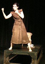 Sur une planche surélevée et étriquée, une femme se démène contre sa condition stupide d’épouse séquestrée par son mari qui la bat et lui impose toutes les tâches rébarbatives du foyer. Mais elle se révolte mollement comme si l’amplitude de ses mouvements avait été réduite par le manque d’espace. Seul son esprit reste vif et elle s’épanche sur son état de soumission avec beaucoup de finesse et de spiritualité, jusqu’à sa délivrance.