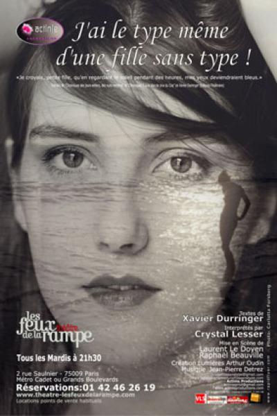 Crystal Lesser voyage plus loin que la nuit et le jour. Un voyage dans l'espace inoui de sa jeunesse, un voyage sur l'eau sacrée d'un passé pas si lointain. Un voyage embarqué à bord d'un manège sur lequel sa vie a tourné vite, beaucoup trop vite.Quand Crystal apparait sur scène, la lumière prolonge l'inconnu qui se dissimule derrière ce regard figeant le temps. Les yeux suivent la cadence des chroniques exprimées. Des bouts de vie livrés avec la saveur que chacun voudra bien leur accorder.Durringer, c'est un raconteur d'histoires, un baroudeur de la langue. Il balade les mots avec une extrême violence. L'intensité provoquée illustre l'imagination avec les couleurs de la réalité. Il rentre en conflit avec un mystère qu'il veut sien. Une façon détournée de fuir le monde pour se réfugier dans une profondeur intérieure dont les limites se confinent dans l'insondable.Sylvie, c'est une jeune femme hors-du-temps, abandonnée, contrainte de lutter dans la nuit de ses jours. Elle donne l'apparence des jeunes filles en fleur posant sur la couverture des magazines de mode. L'image se brouille quand le personnage sort de sa réserve et sert pêle-mêle des mots bruts et sincères. Sylvie serre les dents quand elle fait allusion à son physique. Elle se glisse dans le corps d'une autre et pourtant le sien est parfait. Elle se ronge les sangs car les mecs ne se retournent pas pour la regarder. D'autres clichés de sa vie sont ainsi librement exprimés comme une galerie de tableaux peints dans l'obscurité.Crystal s'habille en Durringer. Un style dont le raffinement est synonyme de poésie, elle porte la matière avec légèreté et fantaisie. Une écriture haute-couture pour les filles de caractère osant défendre l'humain par l'humain, bravant les blessures de l'existence en fédérant des énergies.La mise en scène de Raphael Beauville et Laurent Le Doyen est puissante car elle dénonce une profusion de sentiments lancés avec tempérance et conviction. Un spleen de jeunesse qui se fond dans un miroir sans tain et projette les reflets d'une autre personne soucieuse et blessée. L'adaptation des Chroniques de Durringer offre une pièce de théâtre de belle facture réalisée avec la profondeur du sujet textuellement évoqué.La lumière est parfois fluide, parfois nébuleuse, une articulation bien adoptée selon l'évolution de la pièce.La musique donne envie d'ouvrir un bal improbable car elle est entrainante ou romantique. Elle s'accorde à merveille avec la mise en scène et les jeux de lumière.J'ai le type même d'une fille sans type, un excellent moment passé à écouter la prodigieuse et talentueuse Crystal Lesser sur la scène des Feux de la rampe.