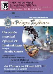 Quel petit garçon n’a jamais rêvé Prince et cheval blanc ? L’homme, avant de construire son histoire, vit de rêves et ce, avant de rêver d’en vivre. Si une force maléfique les lui ôte, que deviendrait-il ?Les effets de lumière suivent le fil de l’histoire, à croire que la mise en scène a été pensée en symbiose avec l’écriture. Ils s’ajustent en clair-obscur à la voix de la conteuse quand la situation s’assombrit et illustrent de mille éclats, les véhémences textuelles. Le pianiste, sous un halo protecteur, partage l’aventure du Prince en lui insufflant des airs qui le mettront en confiance, quelque soit les situations.Le conte vibre au son de la voix de Syndie Kourte, le verbe se veut délicat et l’adjectif puissant selon la teneur exprimée. Enfants et parents sont captivés par ce merveilleux conte qui s’apprécie comme les pages d’un livre tournées pour ne plus jamais être refermé.Le Prince Inodore, c’est la joie de découvrir une histoire mélangeant les extrêmes, légèreté et profondeur, liberté et solitude.