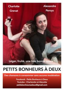 Au Petit Théâtre du Bonheur il rayonne l’amour… Grâce notamment aux Petits bonheurs à deux, spectacle "extraordinaire" de chansons et de textes, interprétés par Charlotte Grenat et Alexandre Peroys. Ces deux tourtereaux nous invitent dans leurs aventures tissées de tendresse, d’échanges, de coquineries même, mais aussi de pudeurs, et difficultés auxquelles chacun(e) se frotte.