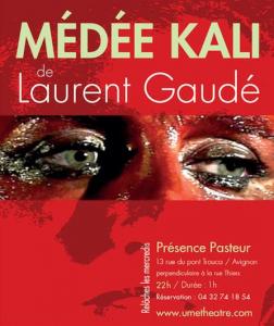 La comédienne Emilie Faucheux couverte de "sang" dans un costume de danseuse incarne cette Médée avec insolence et sensualité. Nous la suivons dans son parcours, nous voyons les hommes qu'elle séduit, nous sommes Médée, nous sommes Kali, et dans un sursaut de réalisme, nous refusons de nous identifier à cet amour maternel mortel. Accompagné d'un contrebassiste (Persée) qui ne parle pas, mais répond par des notes, intensifie cette traversée des continents.