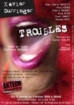 Encore et toujours, mais sans jamais lasser, Xavier Durringer parle du couple, de la violence désespérée des hommes qui sommeille derrière leurs mines de petits garçons jouant les grandes gueules, et de la lucidité résignée des femmes amoureuses qui n’attendent qu’un signe pour s’aveugler à nouveau. Troubles est une création qui a puisé dans plusieurs textes de l’auteur la matière à un spectacle au rythme enlevé et fougueux.