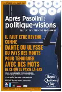 Il y a un avant et un après Pasolini. Pasolini, plus que tout autre, s’est intéressé avec une rare intensité à toutes les formes d’expressions artistiques et s’est adonné autant à la poésie qu’à la littérature, au cinéma, au théâtre, à la critique et à l’analyse politique. Il déclare aussi avoir une grande passion pour la peinture et la musique qu’il a utilisées de manière magistrale comme sources d’inspiration pour son uvre cinématographique. Pasolini dont la vie et la mort furent tels des fragments d’une uvre d’art, est le modèle d’un artiste engagé engagé corps et âme jusqu’à en perdre la vie, dans les combats de la Cité. Pas un instant il ne cesse, à travers ses uvres et ses analyses, d’interroger la place de l’artiste dans le dispositif social et dans les luttes contre les injustices. Que ce soit dans ses films documentaires (Une Orestie africaine, Les Murs de Sanaa, La Rage, Enquête sur la sexualité...), dans ses essais théoriques, ou dans une pièce telle que Bête de style qui montre l’implication d’un poète, Jan Palach, aux prises avec les événements politiques de son temps, on ne cesse de voir Pasolini lui-même faire uvre artistique et/ou philosophique de son observation de ces réalités. Et sans cesse il nous renvoie à cette nécessité de le faire à notre tour, car l’art, et en l’occurrence le théâtre, ne peut perdre de vue cette fonction qui lui est inhérente : être un miroir critique tout autant qu’un espace de partage des événements de notre actualité, des événements conjoncturels qui nous entourent, et de leurs rapports génériques avec la condition humaine.Loin d’être un hommage à Pasolini ce que sans doute il aurait détesté ce spectacle, tout en interrogeant la radicalité douloureuse, parce qu’elle le confine à la solitude, autant que sulfureuse d’un poète, tente d’appréhender, de faire ressentir notre début de XXIe siècle à travers le regard dérangeant, contradictoire, insaisissable, souvent irritant parce qu’extrême et ambigu, d’un des grands esprits du siècle révolu.